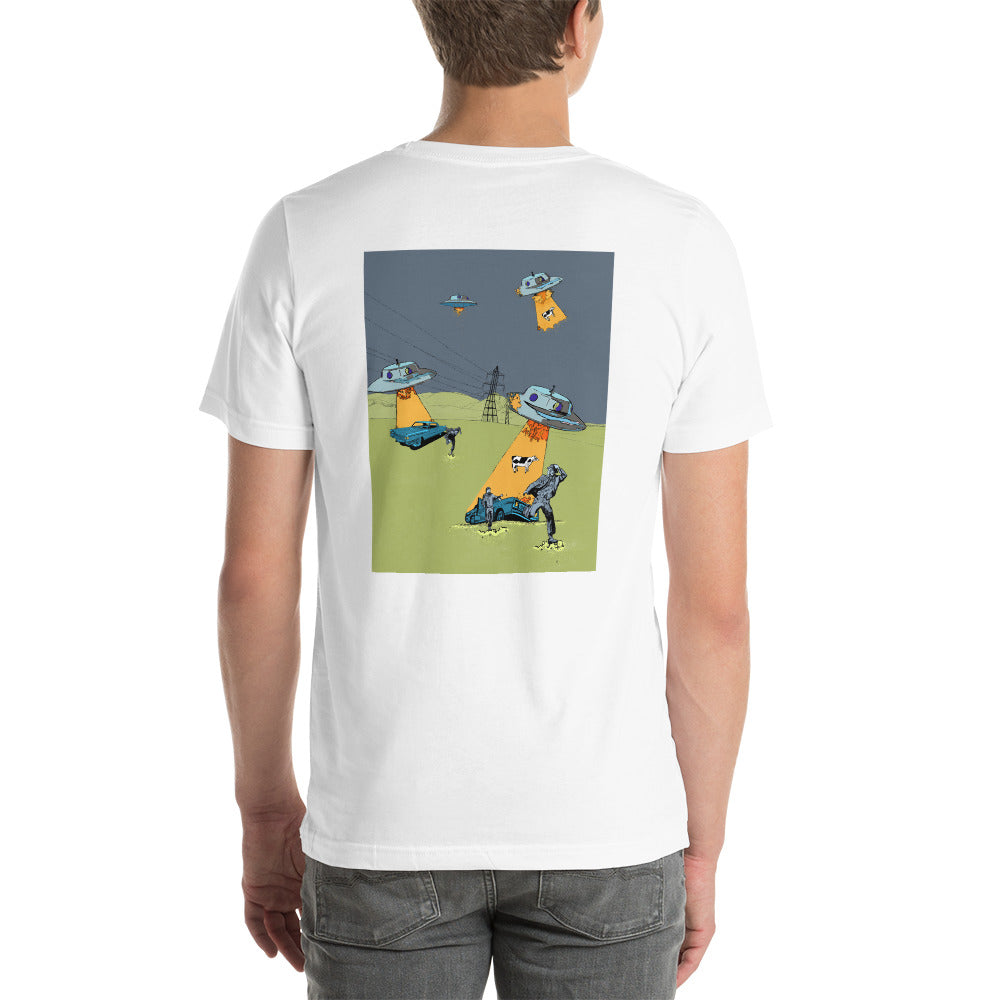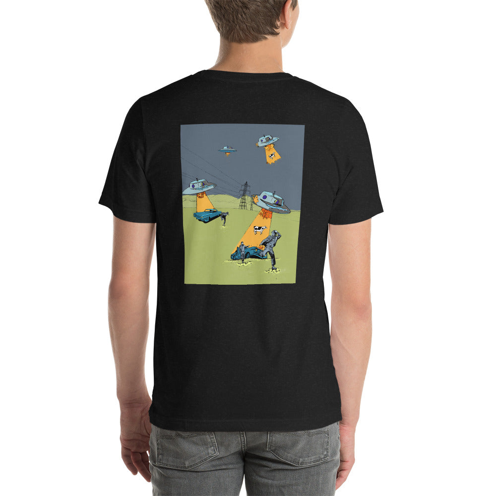 The last time we visited your planet we found the best way to hide in plain sight, was to dress like an earthling. You can be totally unknown to the greater Populus, it's a perfect disguise. If you're looking to become an abductee this short sleeve, unisex t-shirt will let fellow aliens know you're there and you're ready. It is soft and lightweight meaning you can signal in comfortable materials that suit all life forms.